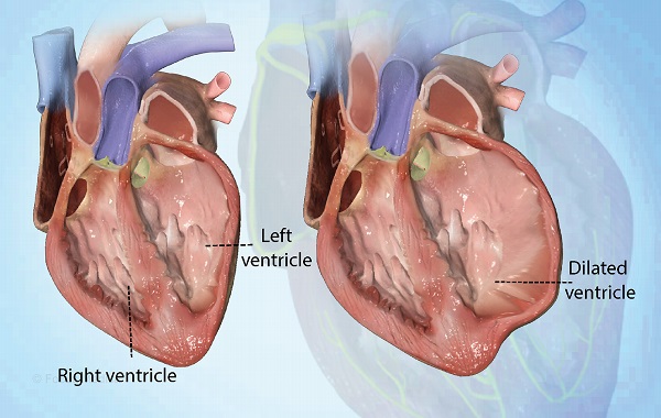 Buồng tâm thất trái giãn ra (bên phải) trong bệnh cơ tim giãn