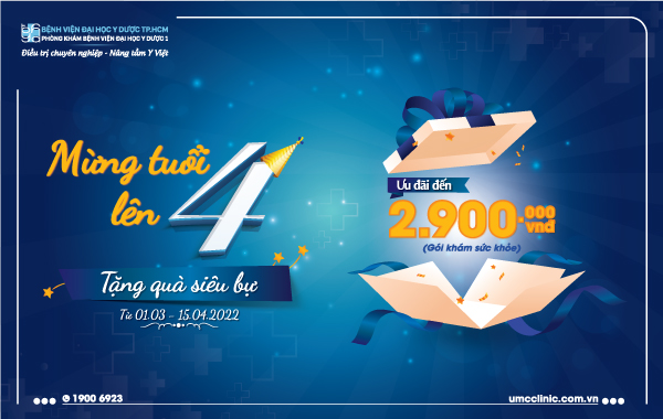 Nhân kỷ niệm 4 năm thành lập, Phòng khám Bệnh viện Đại học Y Dược 1 gửi tặng ưu đãi đặc biệt thông qua chương trình “Mừng tuổi lên tư – Tặng quà siêu bự” thay lời cảm ơn khách hàng vì đã yêu mến và đồng hành cùng Phòng khám.