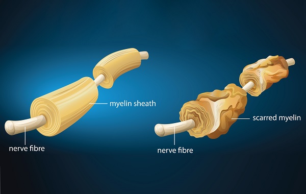 Myelin là vật liệu bao quanh và bảo vệ các tế bào thần kinh. Tổn thương Myelin làm chậm hoặc gián đoạn việc truyền thông tin giữa não và cơ thể, dẫn đến các cơn loạn chức năng gián đoạn và hồi quy của tủy sống, cuống não, tiểu não, dây thần kinh thị giác và loạn chức năng não.