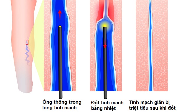 Bệnh nhân có thể được cho sử dụng thuốc an thần và gây tê tại chỗ. Bác sĩ sẽ sử dụng máy siêu âm để xác định vị trí tĩnh mạch bệnh lý, sau đó đưa một ống thông vào trong lòng tĩnh mạch thông qua một lỗ kim nhỏ trên da. Thường vị trí đưa ống thông vào nằm ở ngay dưới khớp gối, một số trường hợp có thể là tại vị trí cổ chân. Bác sĩ sẽ bơm nước muối sinh lý và thuốc tê dọc theo tĩnh mạch bệnh lý, sau đó sử dụng laser hoặc sóng cao tần để đốt tĩnh mạch.