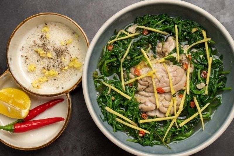 Nguyên liệu: 1 bộ óc heo tươi, 1 nắm lá ngải cứu, gừng, hành tím, gia vị.