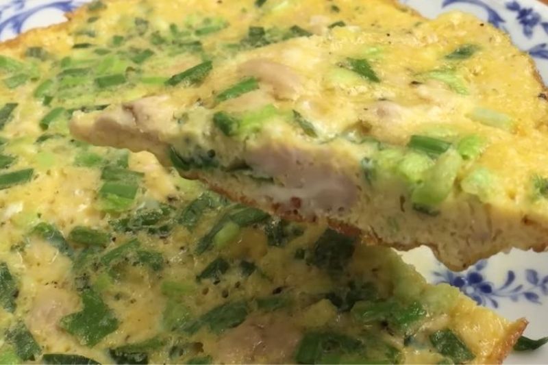 ● Làm nóng chảo với một chút dầu ăn, đổ hỗn hợp trứng và óc heo vào rán vàng đều hai mặt.