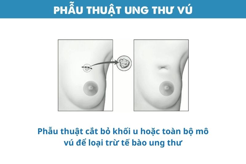 Phẫu thuật cắt bỏ khối u hoặc toàn bộ mô vú để loại trừ tế bào ung thư. Đây là phương pháp mang tính triệt căn, giúp loại bỏ nguồn gốc ung thư ngay từ giai đoạn sớm.