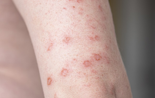 - Các vết sẩn màu đỏ hồng, hình bán cầu, xung quanh có viền vảy, xuất hiện ở các vùng da khác nhau.